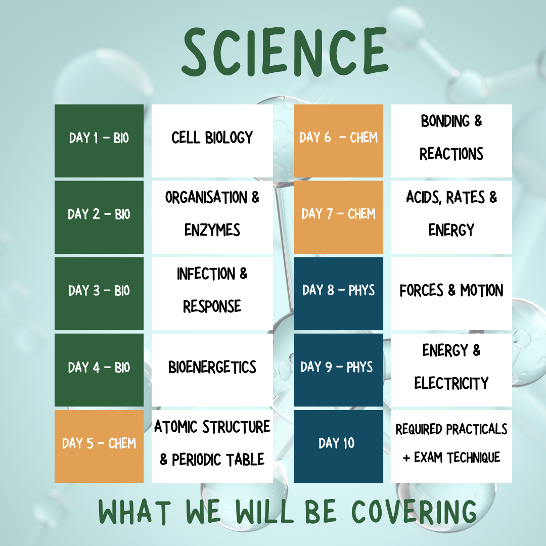 Every Weekday from the 30th of March to the 1st of April at 10am to 11am we will be covering the core topics for GCSE Science.